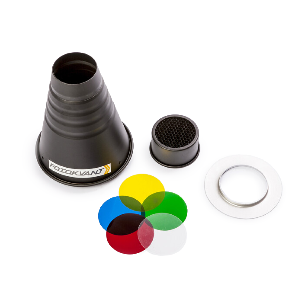 Узкоугольная насадка Fotokvant SNOOT-22-EP с комплектом цветных фильтров. Длина насадки - 22 см. Байонет - Einstein Paul C. Buff. Применяется для получения различных световых эффектов в творческой фотографии. Узкая носовая часть диаметром 5,8 см, широкая - 11,6 см. Длина насадки – 19,8 см. В комплекте пять цветных фильтров (прозрачный, синий, красный, зеленый, желтый) и сотовая насадка.