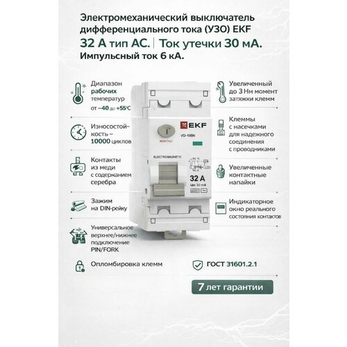 Защитите электросеть от аварийных утечек с дифференциальным выключателем EKF ВД-100N. Устройство реагирует на токи утечки до 30 мА, обеспечивая безопасность при работе с электрооборудованием. Подходит для однофазных сетей с номинальным током до 32 А.