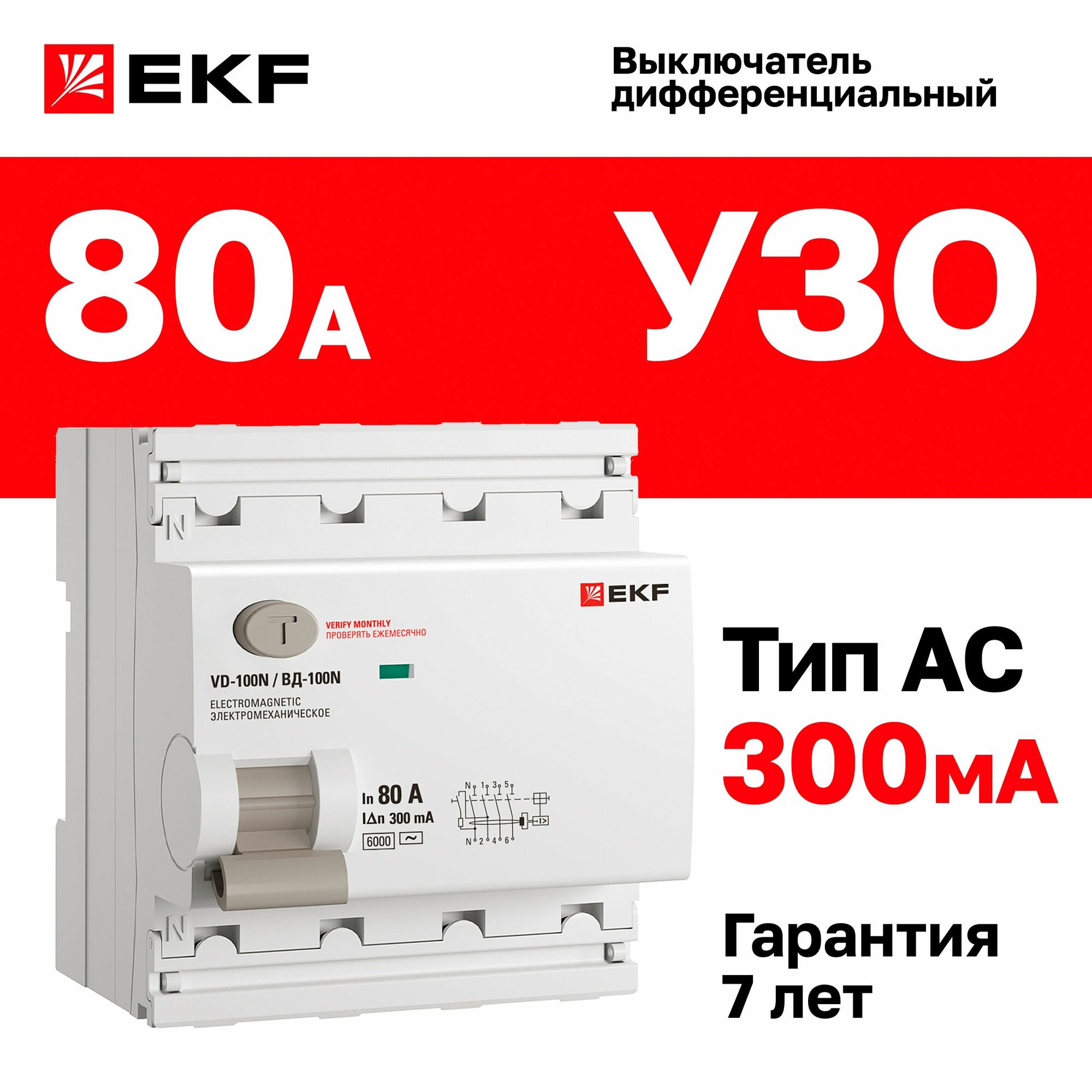 УЗО EKF PROXIMA ВД-100N, 80A, 300mA, 4 полюса, 6kA, 4 модуля: сравнение цен, характеристики, фото, актуальное наличие и цены.