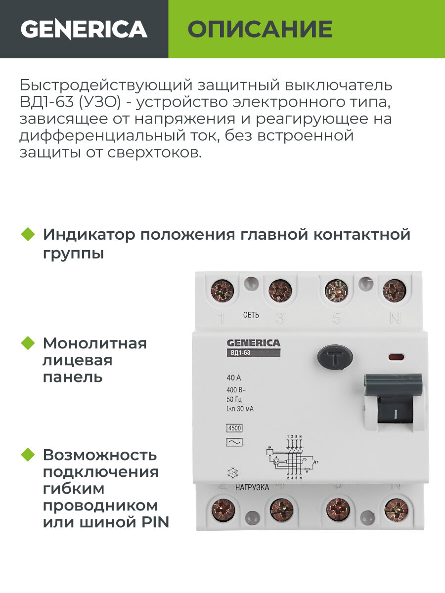 Купить УЗО выключатель дифференциальный ВД1-63 4Р 40А 30мА GENERICA с доставкой по всей России. УЗО выключатель дифференциальный ВД1-63 4Р 40А 30мА GENERICA: сравнение цен, характеристики, фото, актуальное наличие и цены.