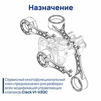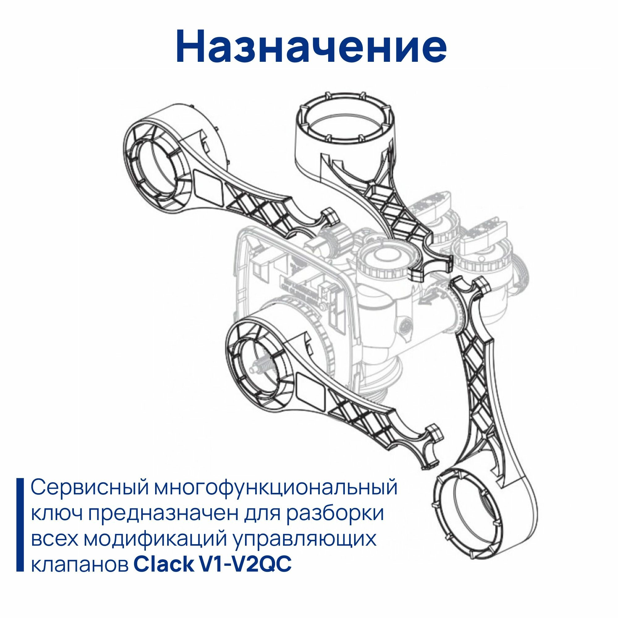 Назначение и особенности Специализированный инструмент для обслуживания клапанов **Clack серий V1 и V2QC, сочетающий функции: - Демонтажа/сборки управляющих клапанов - Грубой механической очистки узлов системы - Профилактического обслуживания оборудования