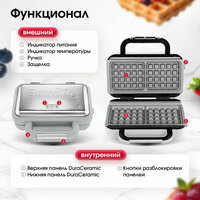 | Особенности | антипригарное покрытие, возможность смены панелей, защита от перегрева, индикатор работы, отсек для хранения шнура |