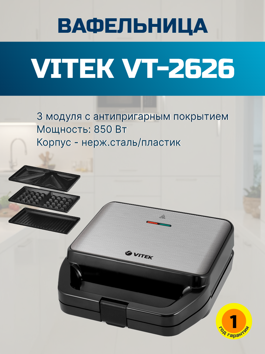Вафельница электрическая со съемными панелями Vitek VT-2626, Пластины для сэндвича, Вафель, Гриля, Мощность 800 Вт, Черный: сравнение цен, характеристики, фото, актуальное наличие и цены.