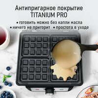 Вафельница позволяет приготовить 4 вафли одновременно. С ней можно приготовить завтрак на всю семью, не потратив на это много времени. Вафельница - это отличный компактный прибор для быстрого приготовления вафель. Для наилучшего пропекания в конструкции реализован равномерный прогрев рабочей поверхности с антипригарным покрытием. Не нагревающиеся ручки позволяют использовать вафельницу без риска обжечься, а система защиты от перегрева исключает повреждение прибора. Вафельница снабжена индикаторами работы и нагрева, а также специальными ножками для устойчивости.