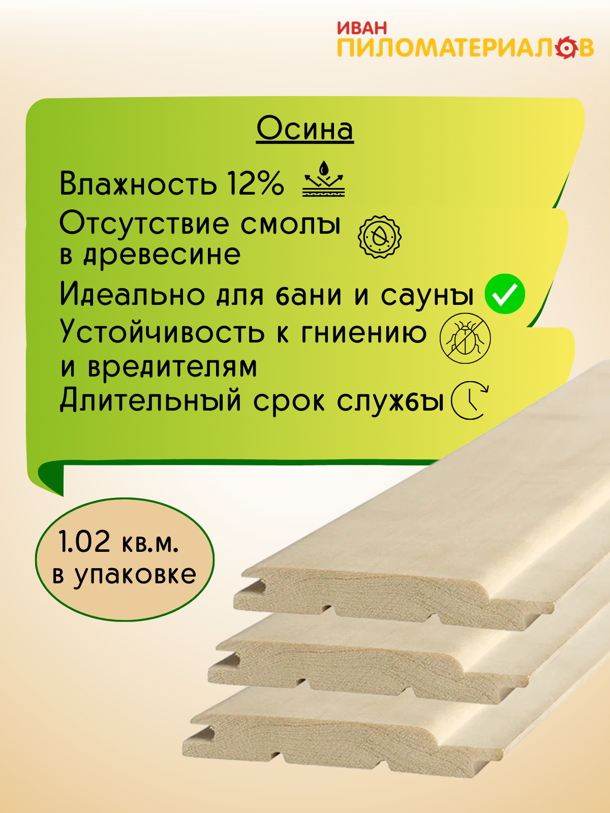 Осина не содержит смолы, поэтом прекрасно подходит для помещений с высокой температурой. Так же она прекрасно противостоит воздействию влаги. Еще одно из преимуществ осины – ее низкая плотность. Из-за этого вагонка сильно не нагревается, и не обжигает тело при касании.