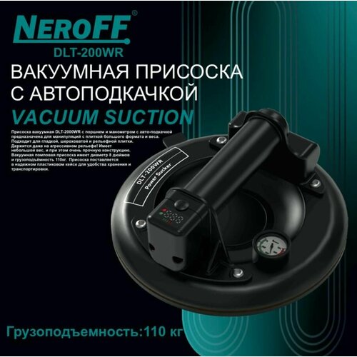 Присоска NeroFF -200WR предназначена для манипуляций с плиткой большого формата и веса. Подходит для гладкой, шероховатой и рельефной плитки. Держится даже на агрессивном рельефе! Имеет невысокий вес и при этом очень прочную конструкцию. Присоска имеет диаметр 8 дюймов. Присоска NeroFF DLS-200WR оснащена встроенным электрическим насосом, датчиком давления и манометром давления для визуального контроля. Датчик давления в NeroFF -200WR анализирует силу разрежения воздуха и автоматически включает насос, когда требуется восстановить необходимые параметры вакуума (автоматическая подкачка). Присоска NeroFF -200WR оснащена мощным и надежным вакуумным насосом. Всасывающего усилия вакуумного насоса достаточно для удержания грузов массой до 300кг – важно! Данный показатель был достигнут на гладкой поверхности с правильным размещением центра тяжести, в реальных условиях этот показатель может быть существенно ниже в зависимости от типа материала.
