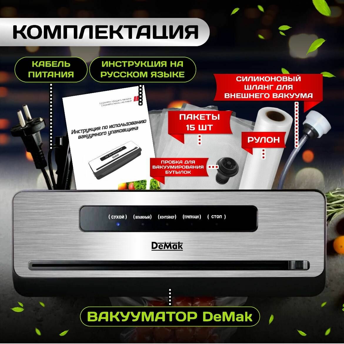 Вакууматор для продуктов DeMak с резаком – это незаменимый вакуумный упаковщик для вашей кухни и дома, который обеспечит длительное хранение ваших продуктов свежими и вкусными. Этот высококачественный кухонный аппарат оснащен полезными аксессуарами и функциональными принадлежностями, делая процесс вакуумирования простым и удобным. Основные преимущества и особенности: Эффективная вакуумная упаковка: Сохраняет продукты свежими в несколько раз дольше, предотвращая окисление и порчу. Встроенный резак: Удобное нарезание пакетами на нужные размеры, экономя ваше время и усилия. Прочные пакеты для запайки: Высококачественные материалы обеспечивают долговечность и надежность вакуумной упаковки. Металлические и прочные компоненты: Гарантия долговечности аппарата и его устойчивости к интенсивному использованию. Легкий в использовании: Интуитивно понятное управление доступны даже для новичков. Идеален для хранения овощей, мяса, рыбы и других пищевых продуктов. Этот вакуумный запайщик является отличным выбором для тех, кто ценит свежесть и качество своих продуктов. Вакууматор DeMak станет вашим надежным помощником на кухне, позволяя легко и быстро запаивать продукты в прочные пакеты. Основные функции включают автоматическую и ручную запайку, что предоставляет вам полный контроль над процессом упаковки. Также прибор совместим с большинством стандартных пакетов и рулонов, что делает его универсальным кухонным прибором. Вакууматор DeMak с резаком – это сочетание прочности, функциональности и удобства. Наслаждайтесь свежими продуктами с помощью надежного запаивателя от DeMak !