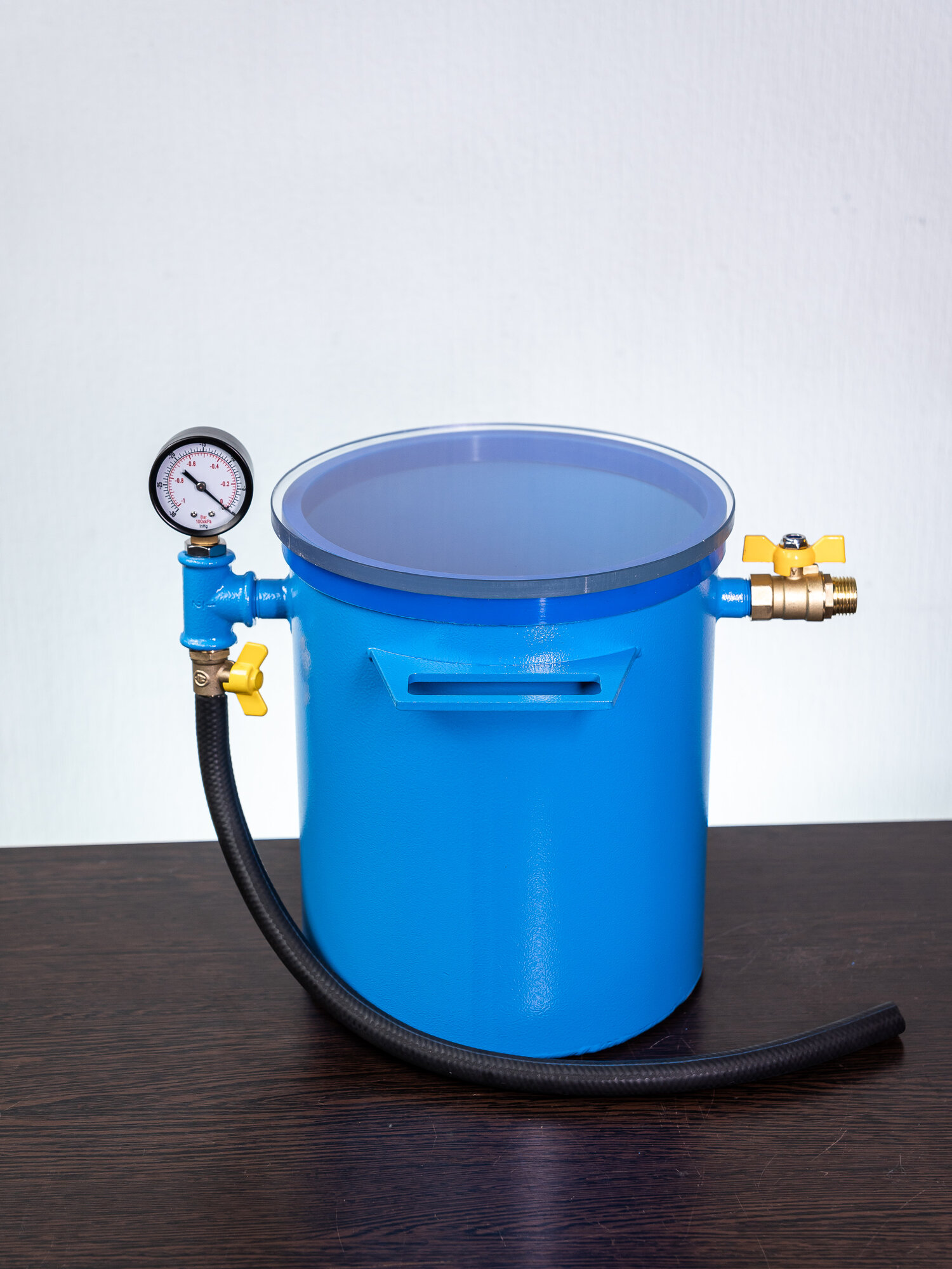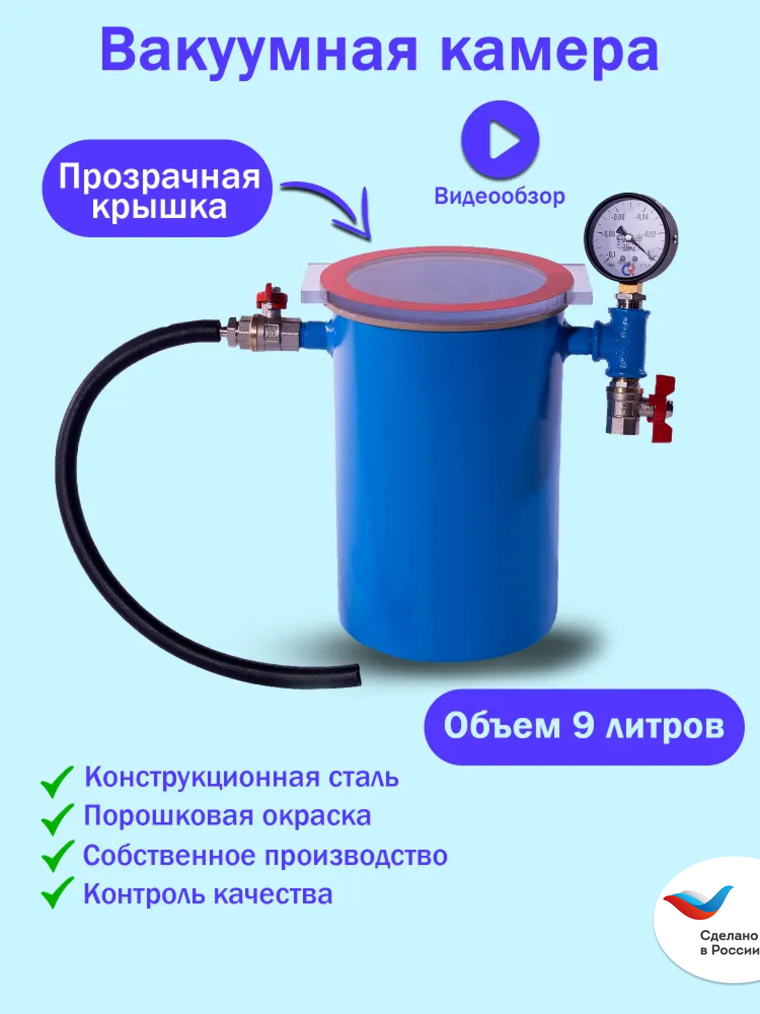 Данная камера имеет металлический корпус с заваренным дном, укомплектована прозрачной крышкой с уплотнителем, вакуумным шлангом, стравливающим и запорным кранами и вакуумметром.