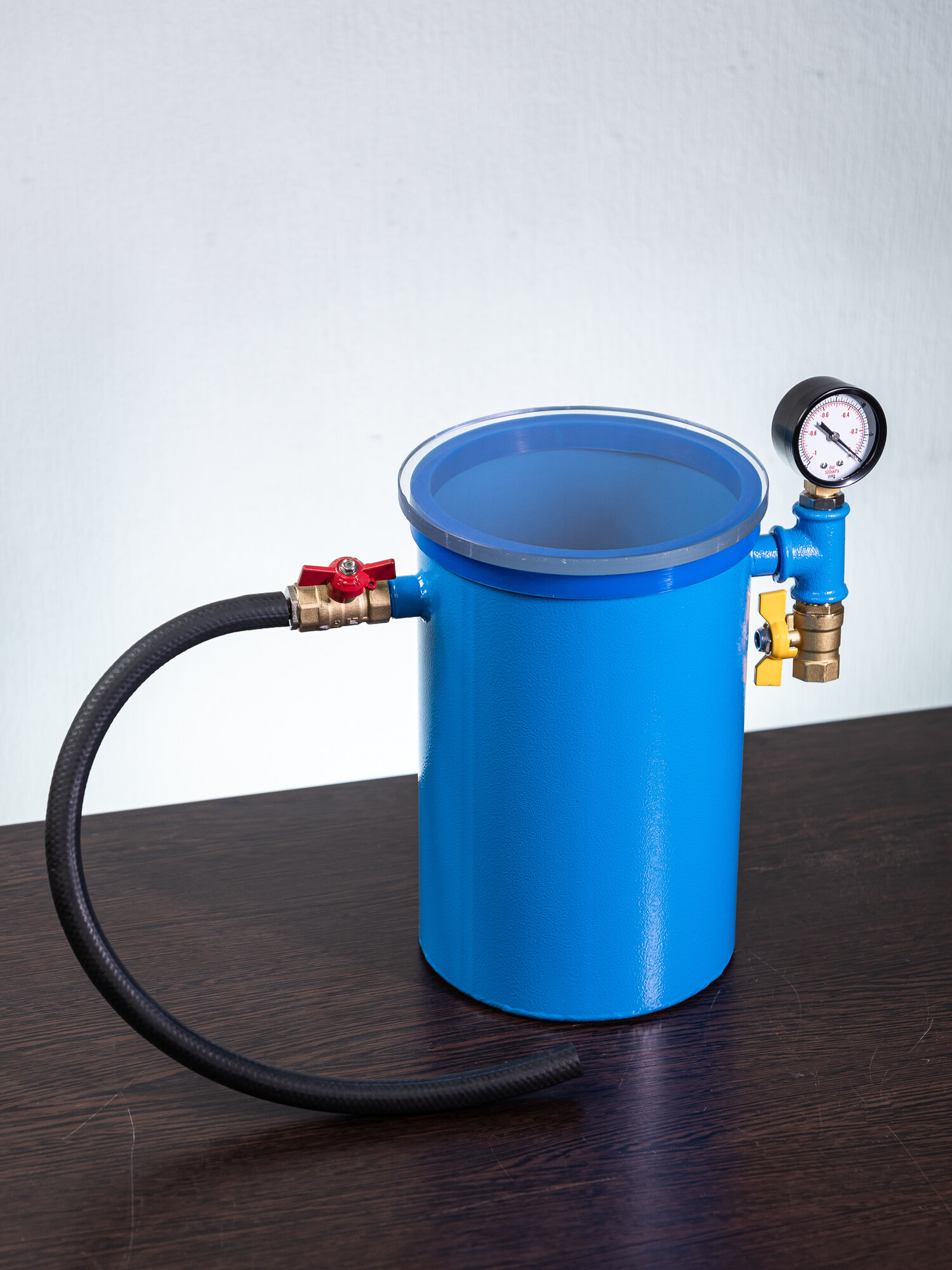 Данная вакуумная система используется для дегазации таких материалов как силикон, полиуретановая резины, всевозможные литьевые пластики и смолы, гипс, керамический шликер и т. д. Также для пропитки и сушки древесины, покраски и напыления различных материалов. Особенностями данной вакуумной системы являются: данная камера имеет металлический корпус с заваренным дном, укомплектована прозрачной крышкой с уплотнителем, вакуумным шлангом, стравливающим и запорным кранами и вакуумметром, дополнительно может быть выполнено внутреннее покрытие на основе эпоксидной смолы - устойчивой к растворам кислот и щелочей, моющих средств и минеральных масел.