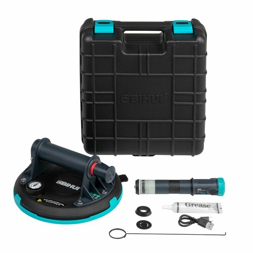 Вакуумная помповая присоска Ø8 дюймов (203мм) от BIHUI предназначена для гладкой и рельефной плитки. Грузоподъёмность 110кг. Присоска оснащена вакуумной кнопкой нагнетания давления с индикаторной линией - на ней имеется красная метка, которая предупреждает о снижении давления и необходимости подкачки и манометром давления для дополнительного контроля. Также вместо оригинального механического поршня вакуумной присоски можно использовать электрический поршень который идет в комплект, который предназначен для упрощения и ускорения процесса работы с вакуумной присоской и работы с агрессивным рельефной (производите перемещение материала при работающем порше). Представляет собой механизм, который создает вакуум путём выкачивания воздуха из рабочей зоны между основой присоски и материалом. Питается от одного литий-ионного аккумулятора Li-Ion 3,7V типоразмера 18650 который поставляется в комплекте вместе с кабелем зарядки. Поставляется присоска в надежном пластиковом кейсе для удобства хранения и транспортировки.