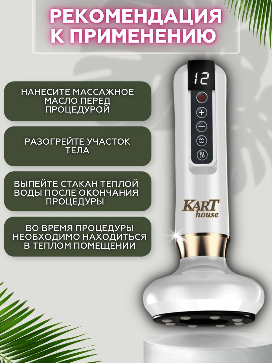 Внимание: аппарат НЕ включается, когда подключен К зарядке! Электромассажер для тела-это косметический аппарат, который необходим для женщин и мужчин. Вакуумный лимфодренажный массажер от бренда Kart House- это сертифицированный в России электрический массажер для тела нового поколения для похудения, от живота, от целлюлита, также от растяжек, для сжигания жира, против отеков на коже, для коррекции фигуры и для уменьшения объемов. Действие массажа основано на таких массажных техниках, как: баночный вакуум, лимфодренажный массаж, LPG массаж, горячий компресс, что придает комплексное оздоровление организму. Наш электрический прибор для тела расслабляет мышцы, улучшает ток крови и лимфы, снимает мышечное напряжение, спазмы и зажимы, помогает убрать подкожный жир, за счет чего кожа становится более упругой. Ваш живот скажет Вам "Спасибо". Массажер для ног и рук заменит сеанс расслабляющего массажа и способствует омоложению. Баночный массаж и прогрев тканей улучшает периферийную циркуляцию крови, лимфы, межтканевой жидкости, а также может использоваться при респираторных заболеваниях и простудах. Массажер для шеи оказывает комплексное расслабление, чувство релакса, антистресс, уменьшаются отеки. Если Вас мучают триггеры под лопаткой, то массажер для спины выведет шлаки и пригонит питательные вещества для быстрого восстановления тканей. Массажер для похудения живота помогает убрать жир, живот станет более упругим. Антицеллюлитный LPG массажер поможет разгладить апельсиновую корку и способствует уменьшению объемов. Ручной аппарат имеет инфракрасный нагрев и 12 режимов интенсивности всасывания, каждый сможет себе подобрать свой уровень массажа. Наш компактный массажер можно взять с собой в путешествие, командировку или баню.