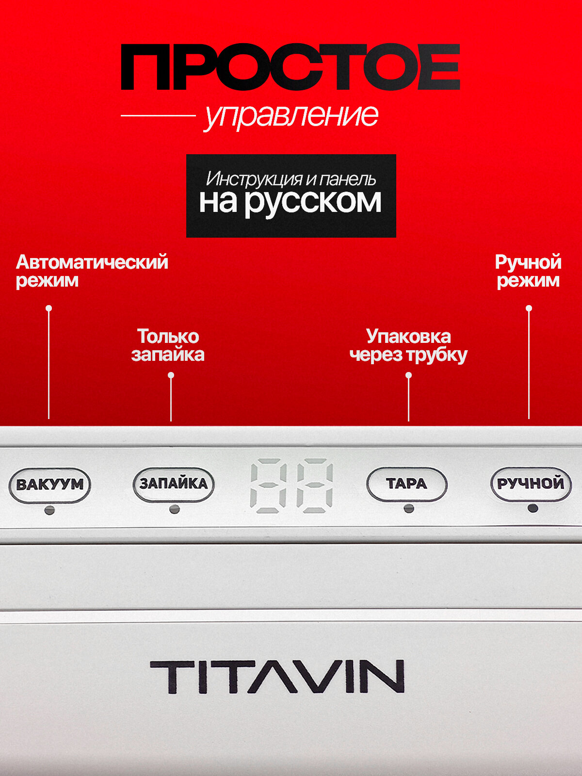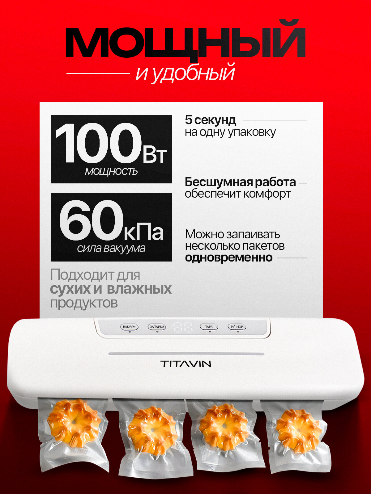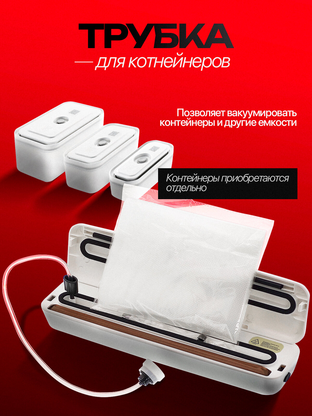 Наш вакууматор для продуктов имеет большую комплектацию, представленную на рынке среди кухонной техники. Кроме самого вакууматора, вы получите в подарок 10 пакетов для с самым универсальным размером (30х25см) поэтому вы сможете завакуумировать свой первый продукт сразу после получения вакуумного аппарата. Также в упаковке вы найдете пробку для вакуумирования контейнера и шланг (45см) к ней. Эти девайсы помогут вам завакуумировать продукты питания и сохранить максимальную свежеть. Использовать вакууматор максимально просто - есть инструкция на Русском языке с пошаговым описанием процесса вакуумирования и полезными советами по использованию. Сам вакууматор компактный и не займет много места на кухне. Также есть режим вакуумирования контейнеров и режим ручного управления в случае необходимости. Удобное и простое управление не вызывает сложностей при использовании. Вакууматор для продуктов с запайкой имеет высокий уровень вакуума 60кПа и мощность 100Вт. Максимальная ширина пакетов для использования - 30см, минимальная - 12см. Ширина пайки у ваккуматора кухонного 3мм. Используйте только специальные пакеты для запайки, которые подходят для бескамерных (бытовых) вакуумных упаковщиков: рифленые с одной или двух сторон и толщиной 60-120 мкм. Гладкие пакеты не подойдут, т. к. они используются только для камерных вакууматоров.