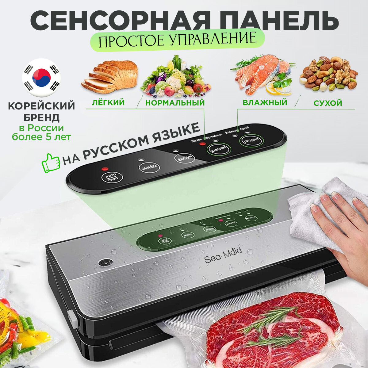 Разборная конструкция вакууматора, позволяет после вакуумирования влажных продуктов промыть камеру нижней части прибора под струёй воды или в посудомоечной машине.