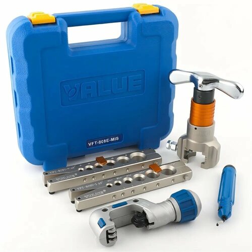 Вальцовка набор с реверсом VALUE VFT-808E-MIS 1/4"-3/4" 2 плашки чемодан, для дюймовых и метрических медных и алюминиевых труб, диаметры: 1/4«, 5/16», 3/8«, 1/2», 5/8 «, 3/4», 6 мм, 9 мм, 10 мм, 12 мм, 16 мм, 19 мм.