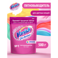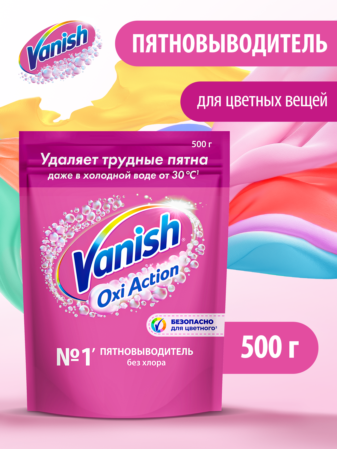 VANISH OXI Action Пятновыводитель для тканей 500 гр. порошок х 2 шт. Пятновыводитель Vanish Oxi Action эффективно удаляет загрязнения с белых и цветных вещей. Средство подходит как для повседневного использования, так и для сложных случаев. Пятновыводитель можно использовать как в холодной, так и в горячей воде. Основной частью состава является кислородосодержащий отбеливатель, который не только качественно очищает одежду, но и сохраняет ее первоначальный цвет. После обработки белье приобретает свежесть благодаря наличию в составе средства ароматизатора. Отсутствие хлора позволяет использовать пятновыводитель со многими видами тканей, кроме шерсти, шелка и кожи.