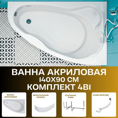 Ванна акриловая 140х90 см Lil комплект 4в1: Ванна правосторонняя, рама, панель фронтальная, слив-перелив 01лил1490пкп