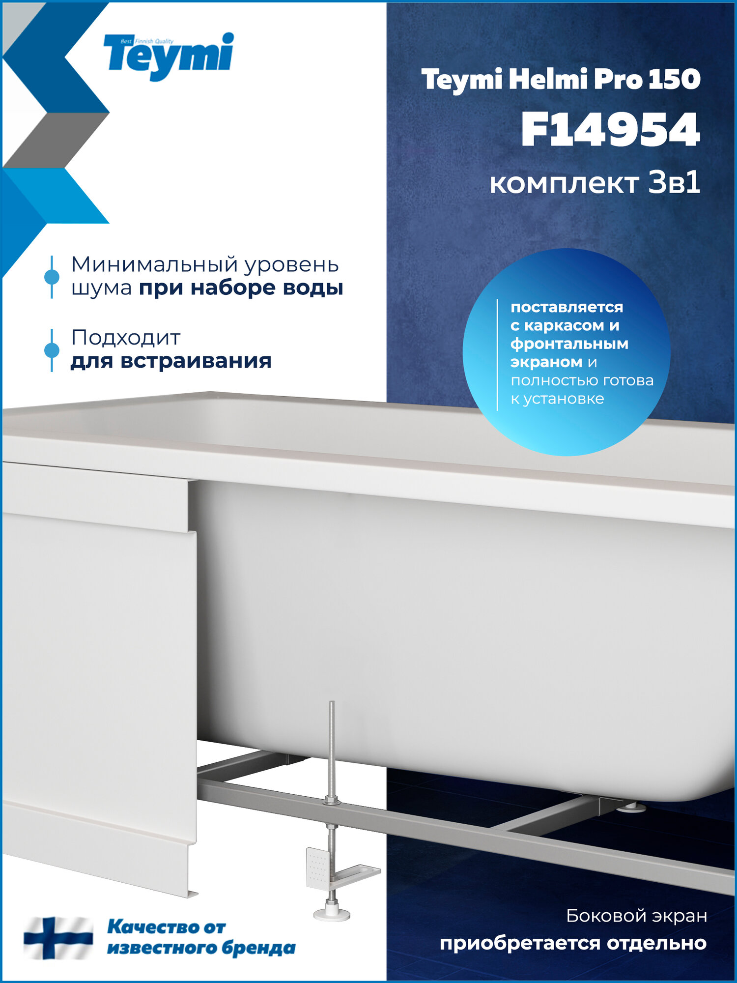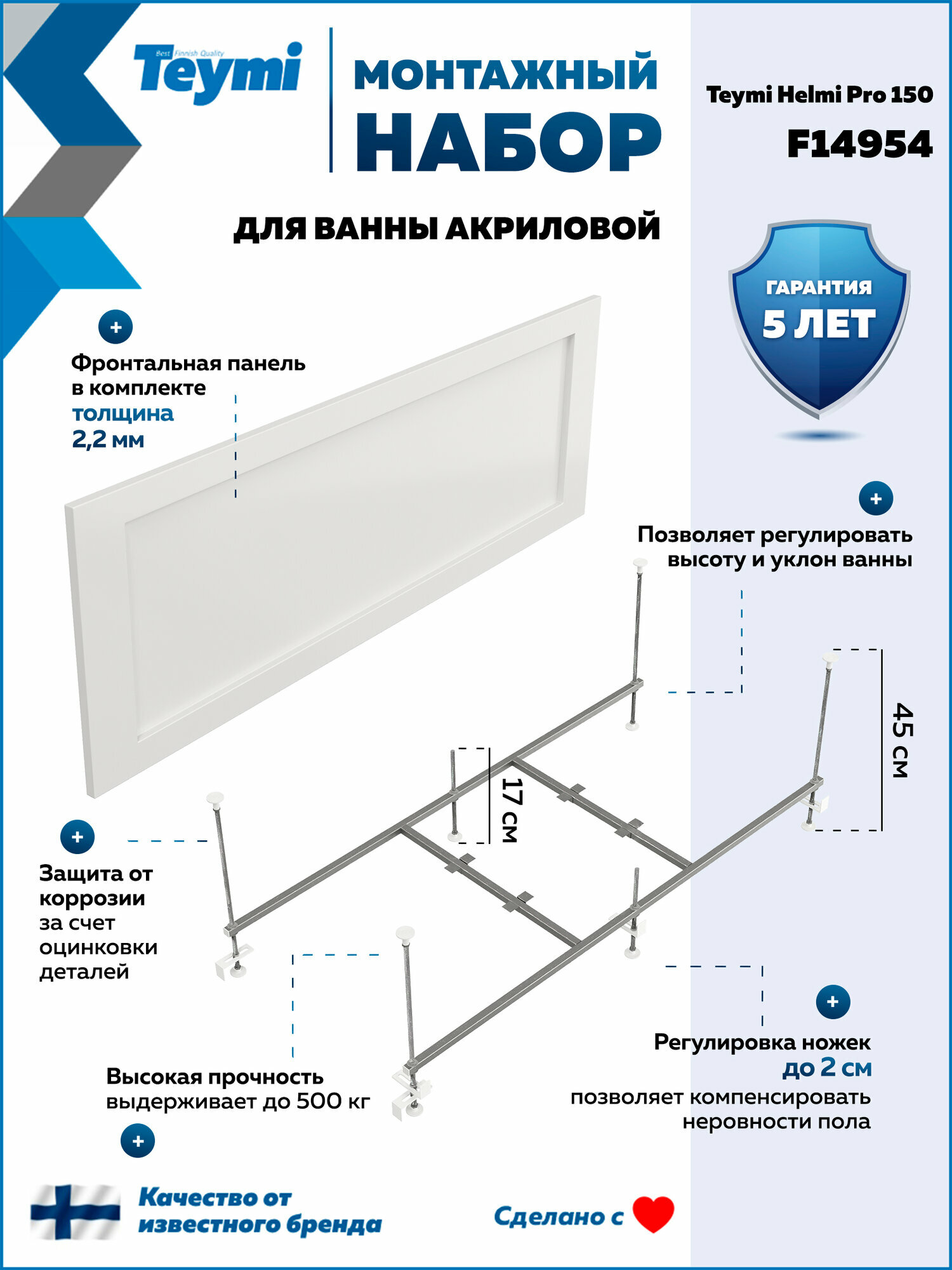 Каркас для акриловой ванны – металлический цельносварной, с минимальным количеством болтовых соединений. Он легко собирается и обладает необходимой конструктивной прочностью. Ножки каркаса регулируются по высоте и позволяют устанавливать ванну на необходимом уровне даже на неровном полу.