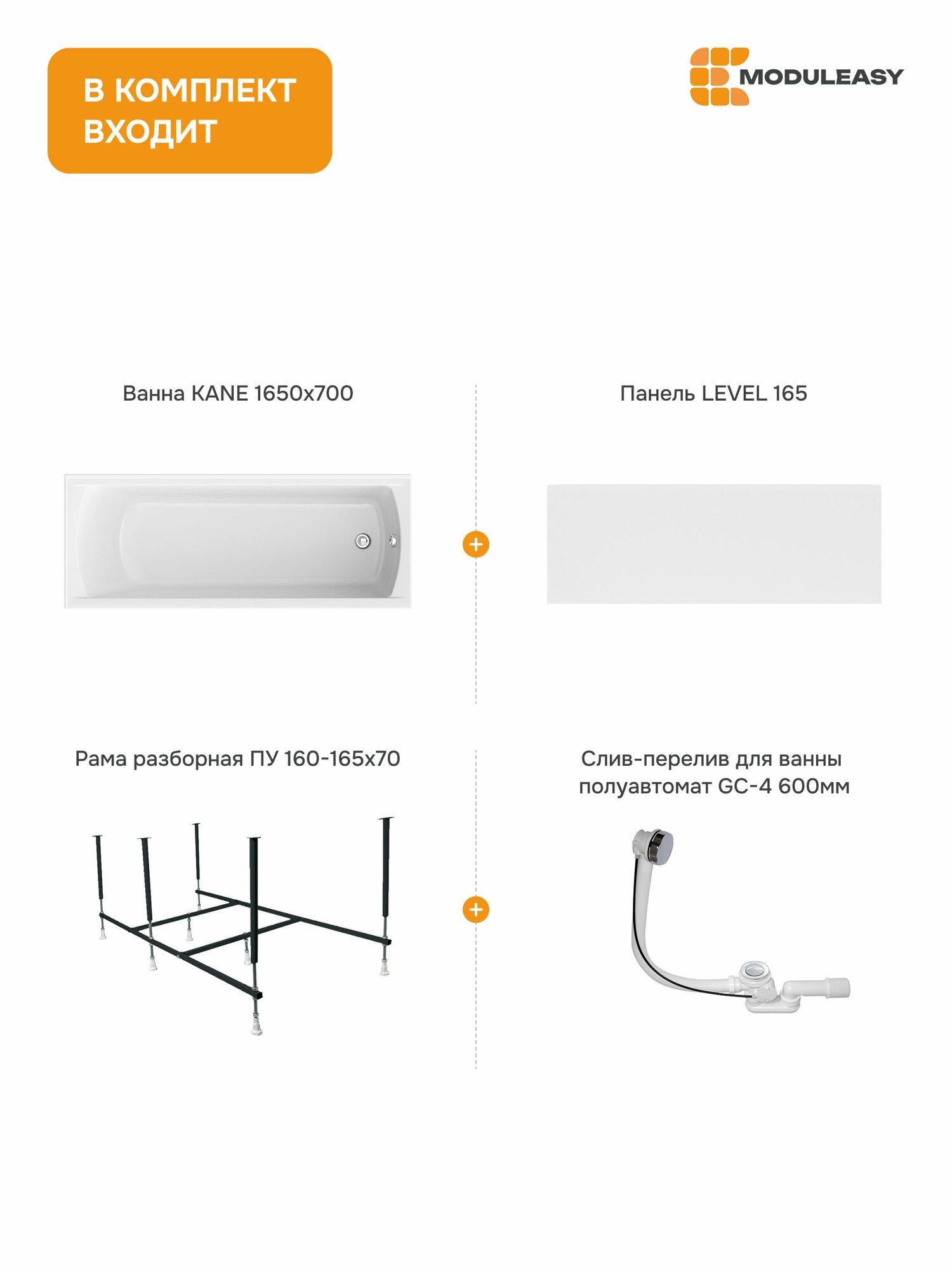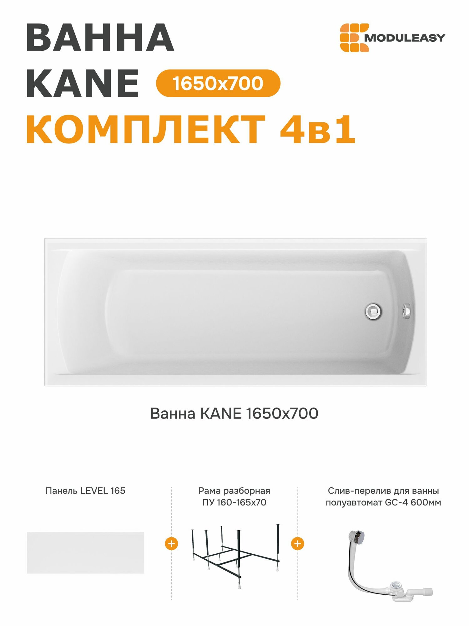 Купить Ванна акриловая 165х70 см KANE комплект 4в1: Прямоугольная ванна, фронтальная панель, каркас, слив-перелив 01кейн16570кп с доставкой по всей России.