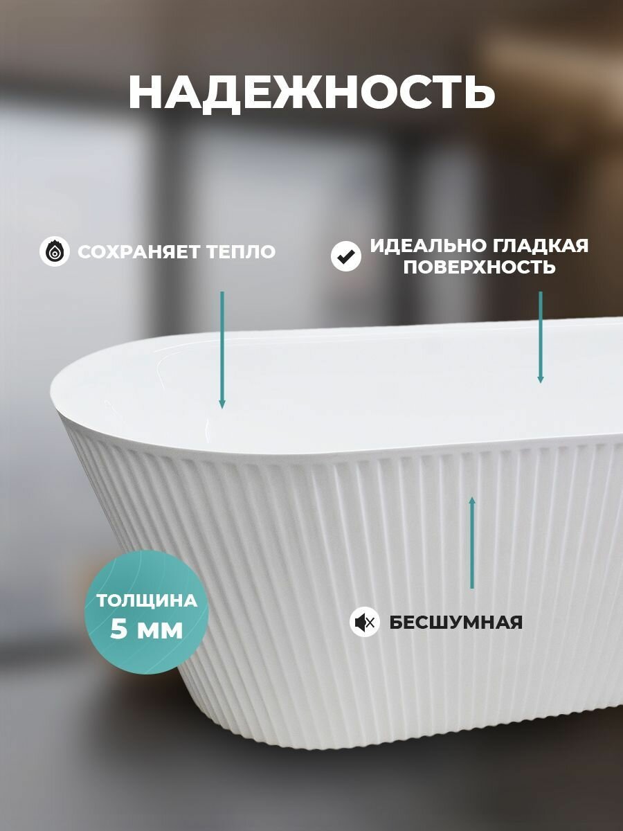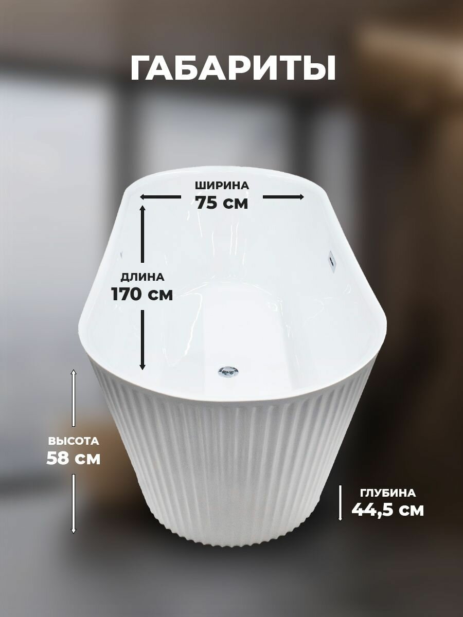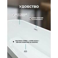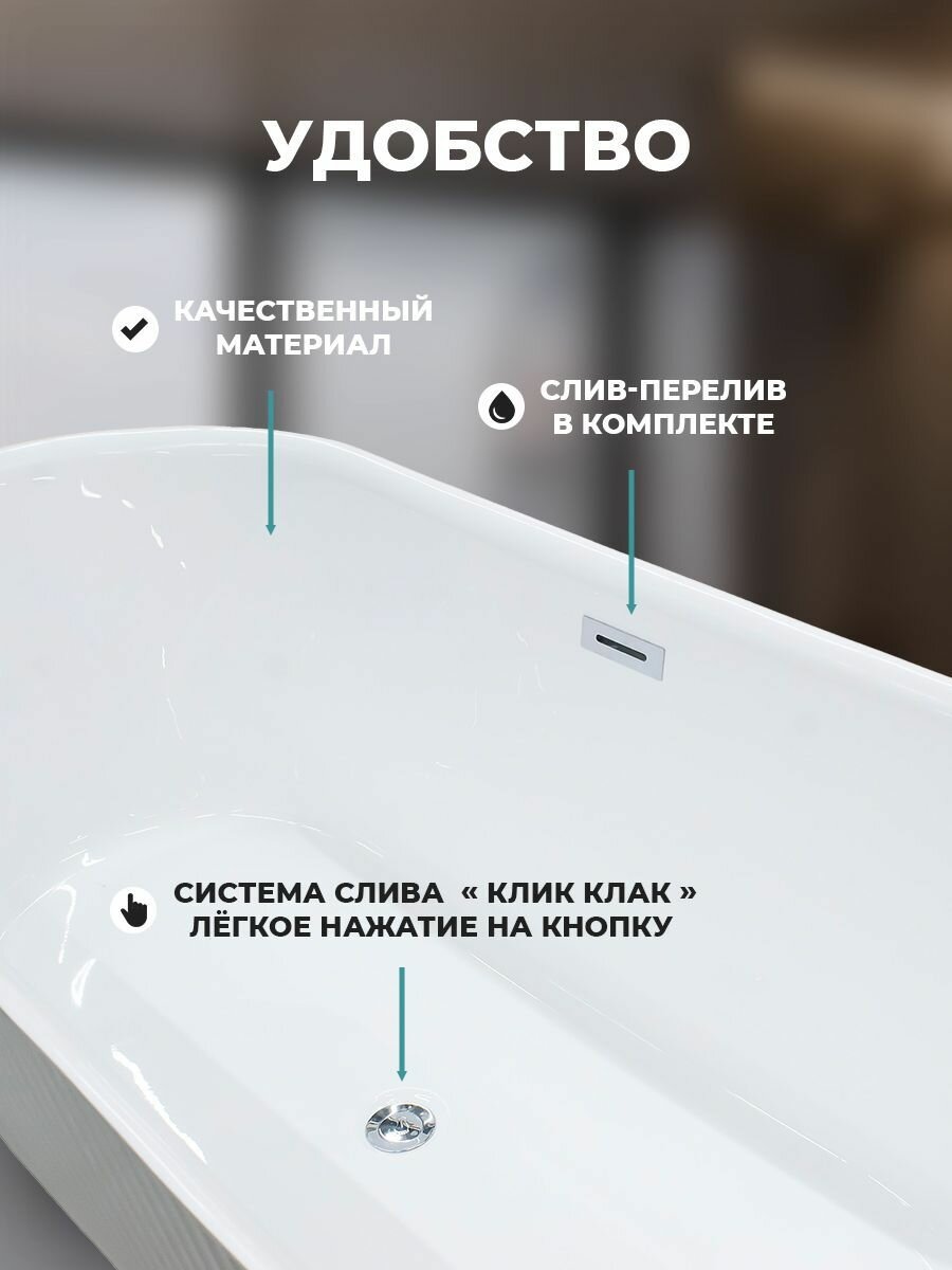 Погрузитесь в мир комфорта и стиля с отдельностоящей ванной Costabell! Эта ванна станет настоящим украшением вашей ванной комнаты, обеспечивая максимальное удовольствие во время водных процедур. Изготовленная из высококачественного белого акрила толщиной 5 мм, она не только привносит изящество и утонченность в любой интерьер, но и гарантирует долговечность и легкость ухода. С размерами 170 см в длину, 75 см в ширину и 58 см в высоту, ванна обладает лаконичными и величественными формами. Объем в 290 литров создает идеальные условия для полного погружения в мир расслабления и комфорта. Глубина в 44,5 см позволяет насладиться полным ощущением тепла и безопасности во время купания. Удобная система «клик клак» делает управление водным потоком невероятно простым. Для наполнения ванны достаточно лёгкого нажатия на кнопку — так же легко вы сможете спустить воду, повторив нажатие. Эта ванна станет не только центром вашей ванной комнаты, но и воплощением стиля, оригинальности и комфорта. Она создаст уникальную атмосферу уюта и спокойствия, где вы сможете забыть о повседневной суете и окунуться в мир абсолютного расслабления. Преимущества: -Эффектный внешний вид - Свобода при выборе места установки - Возможность принимать ванну в лежачем положении, максимально расслабляясь - Свободностоящая конструкция не требует покупки фронтальных экранов - Визуально расширяет пространство ванной комнаты Комплектация: ванна, каркас, слив-перелив, упаковка.
