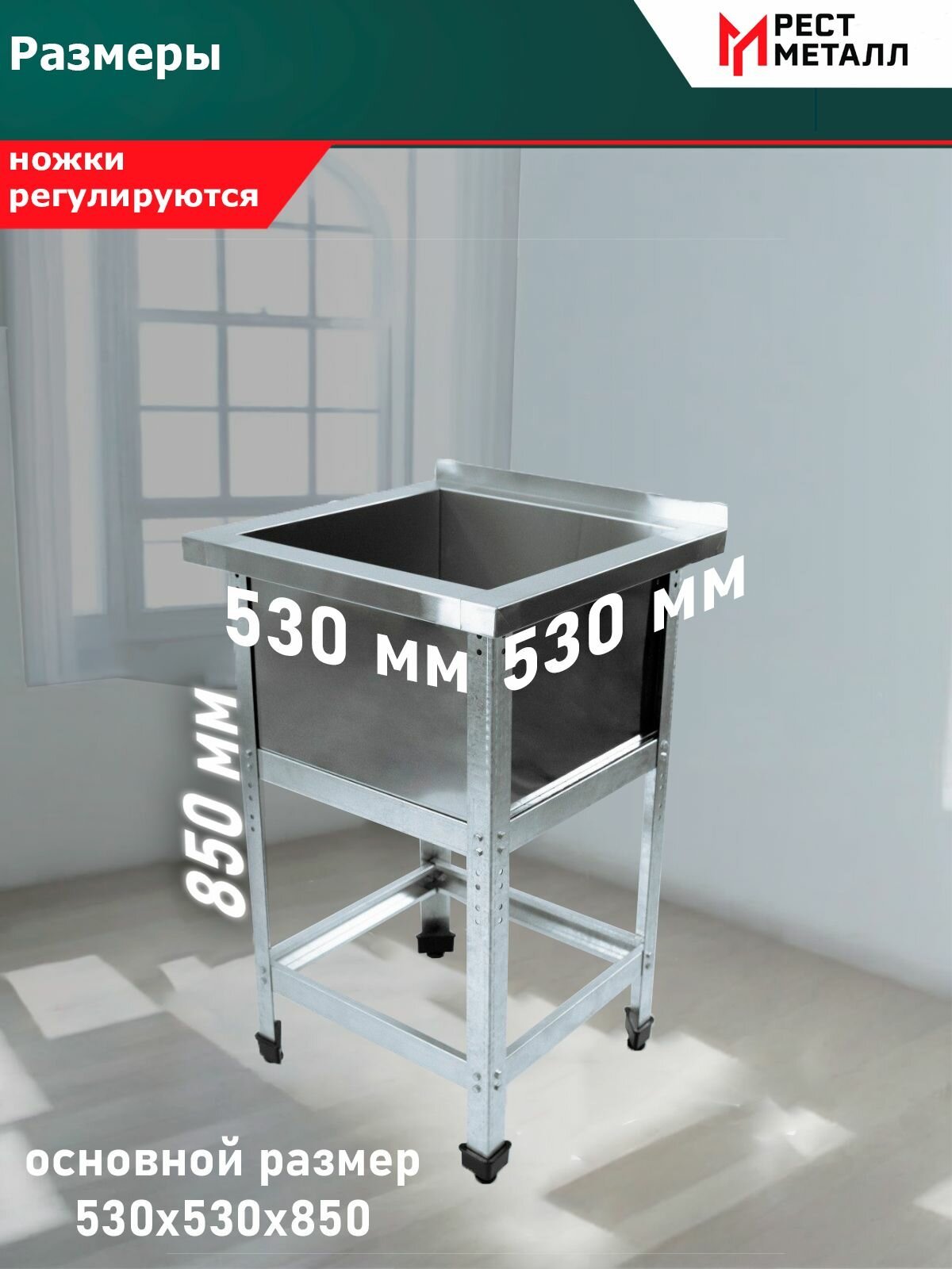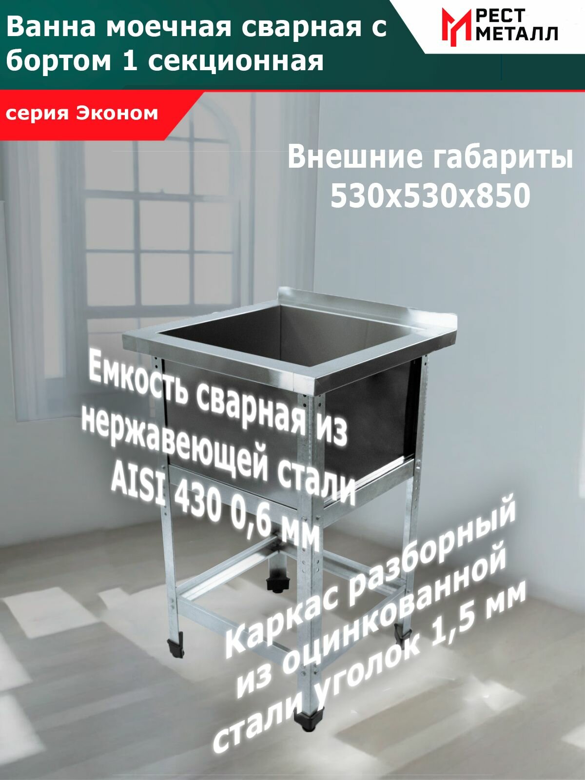 Ванна моечная с бортом сварная 1секц. 530*530*850( 1 м/о 430*430*300) серия Эконом, емкость сварная из нерж. стали AISI 430 0,6 мм и каркас разборный из оцинк. уголка 1,5 мм и стали, обвязка, без фартуков: сравнение цен, характеристики, фото, актуальное наличие и цены.
