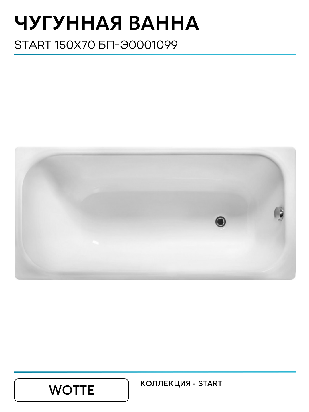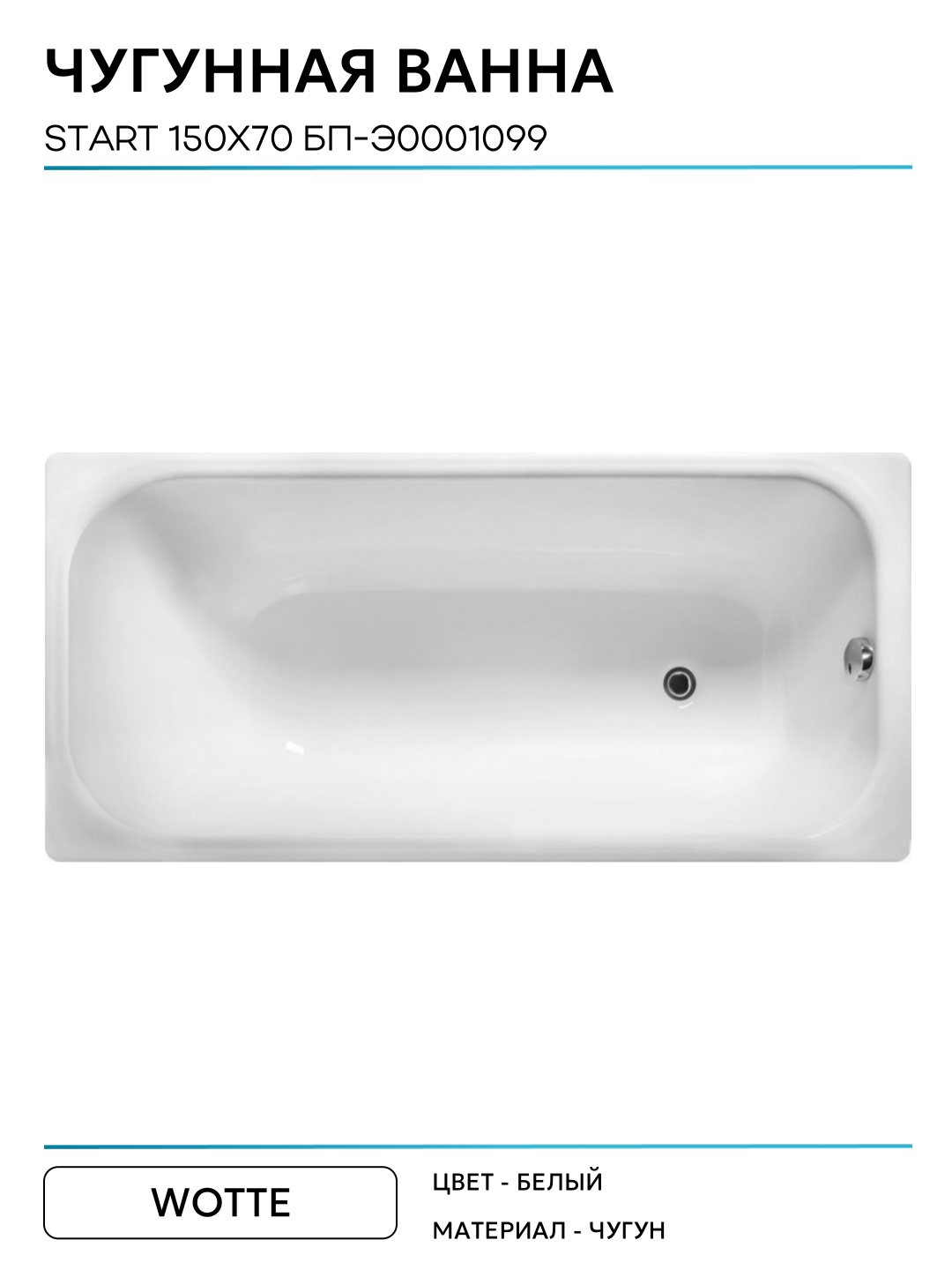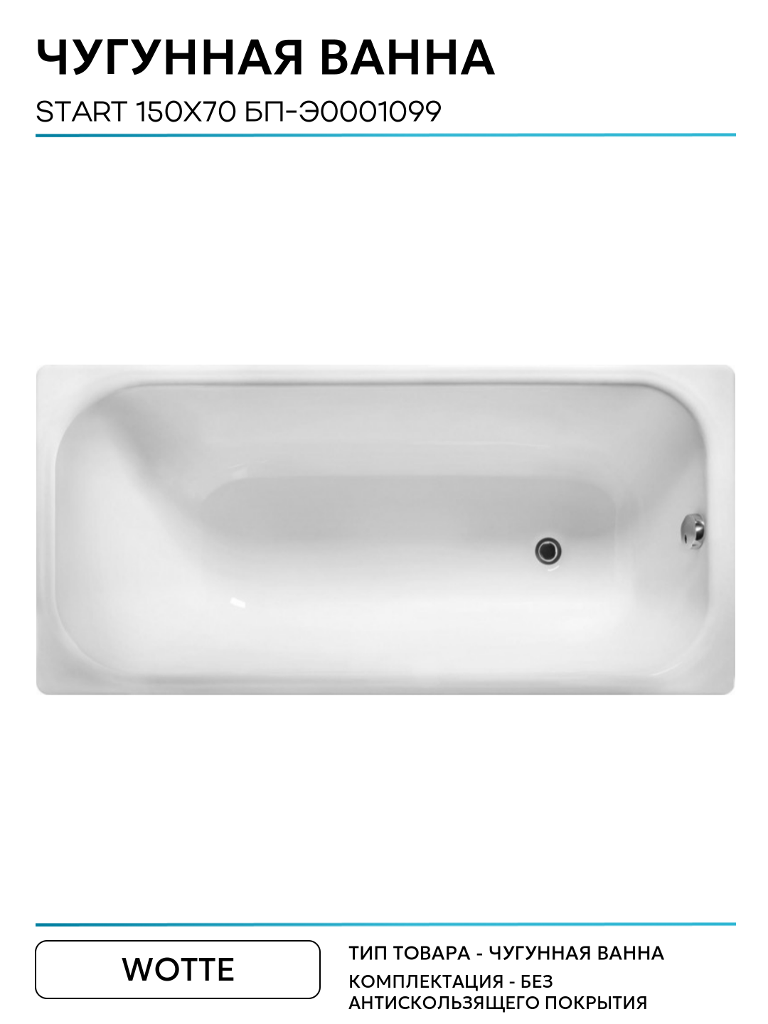 Чугунная ванна Wotte Start 150×70 БП-э0001099 без антискользящего покрытия белый чугун: сравнение цен, характеристики, фото, актуальное наличие и цены.