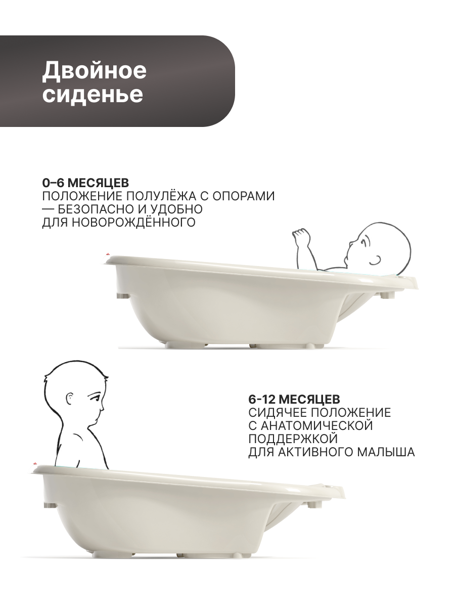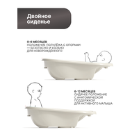Ванночка для купания ребенка. Подходит для купания лежа до 6 месяцев и сидя – с 6 месяцев и до 1 года. Анатомическая распорка для ножек. Три точки опоры (две в подмышках и одна между ножек) для максимального комфорта малыша. Встроенный термометр и индикатор рекомендованного уровня воды. Оснащена пробкой быстрого слива. Возраст: 0-12 месяцев Размеры: 54 x 28 x 94 см.