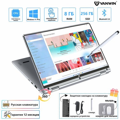 VANWIN Ноутбук Планшетный 2-в-1 11.6″, Intel Celeron N4020C, RAM 8 ГБ, SSD 256 ГБ, ( флип 360°, сенсорный экран)