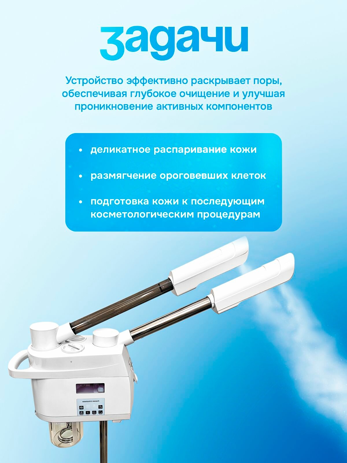 Косметологический вапоризатор с двумя направляющими холодного и горячего пара – цифровой прибор для бережного распаривания и увлажнения кожи в условиях косметологического кабинета. Регулятор мощности позволяет менять силу подачи и температуру пара в соответствии с типом кожи клиента. Датчики уровня воды упрощают работу косметолога и обеспечивают безопасное использование прибора. Функция озонирования предназначена для дезинфекции кожи и снижения риска развития осложнений после процедуры. Аппарат прост и удобен в применении: чтобы начать работу, достаточно залить дистиллированную воду в специальную емкость, включить прибор в сеть и дождаться, когда парогенератор начнет выделять пар. Под действием парообразных молекул воды