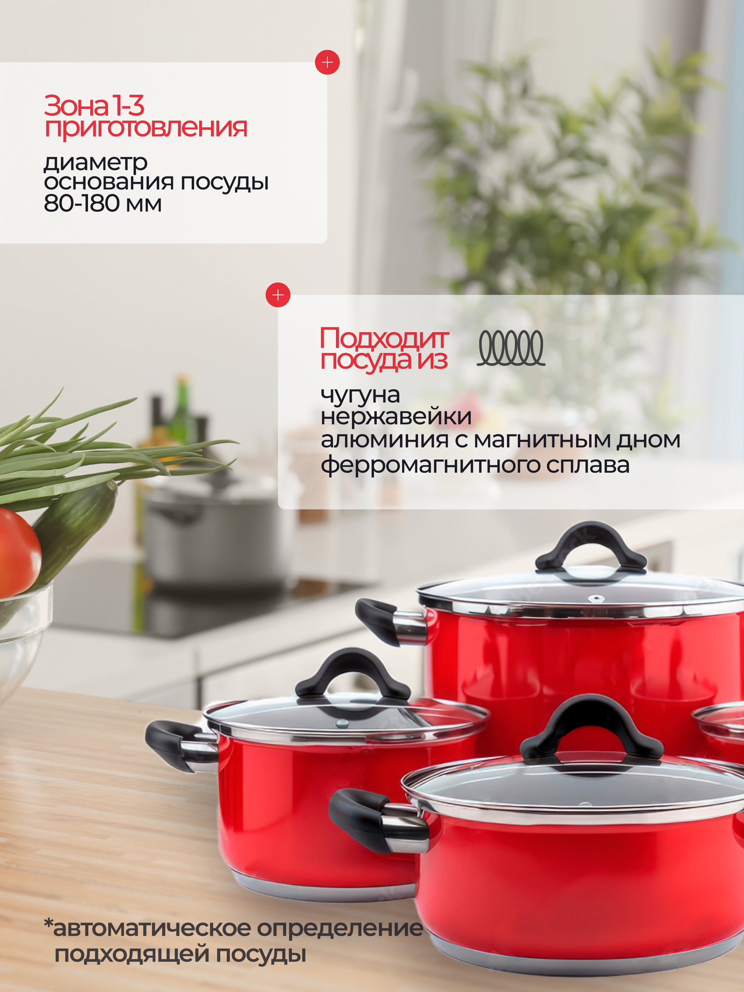 - Автоматическое определение наличия посуды — варочная поверхность работает только при наличии подходящей посуды.