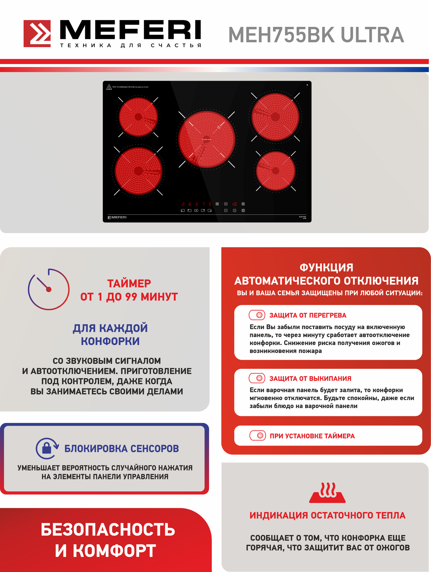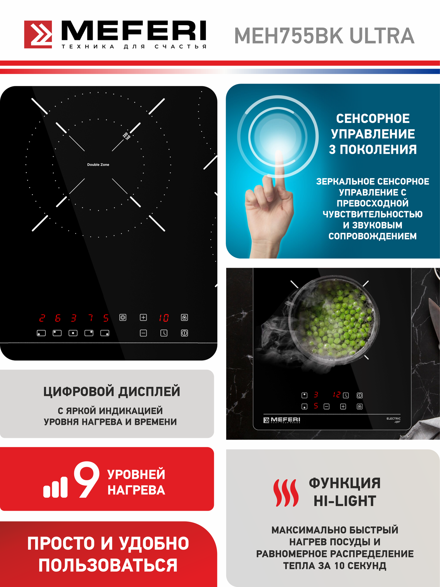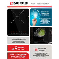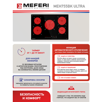 Варочная панель электрическая MEFERI MEH755BK ULTRA 75 см, черный, 8200 Вт, зона расширения, 9 уровней мощности: сравнение цен, характеристики, фото, актуальное наличие и цены.
