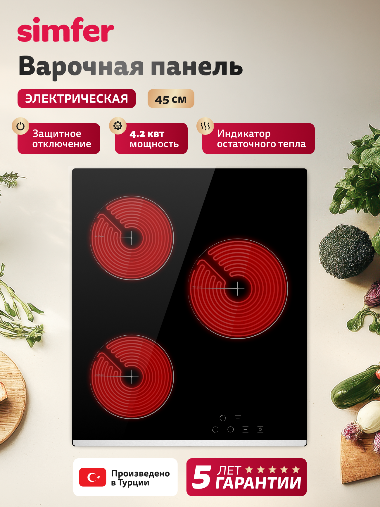 Варочная панель электрическая Simfer 45см, 3 конфорки, 9 уровней, автоотключение, блокировка, 5 ЛЕТ гарантия, турция