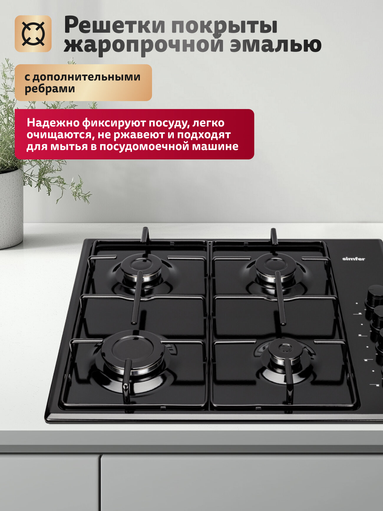 Купить Варочная панель газовая Simfer 60см, 4 конфорки, эмалированные решетки, электроподжиг, 5 ЛЕТ гарантия, турция с доставкой по всей России.