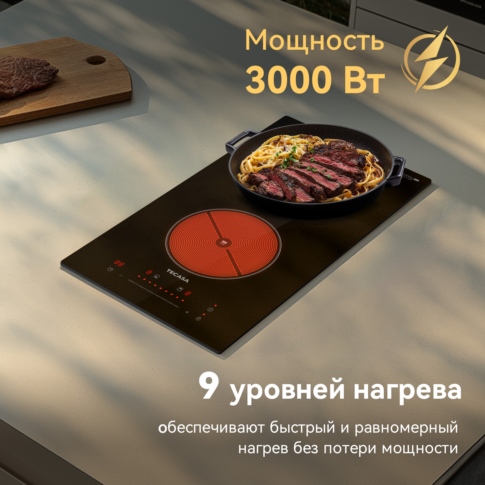 Двухзонная керамическая варочная панель TCH29SB обладает общей мощностью 3000 Вт, при этом каждая зона приготовления имеет 9 регулируемых уровней мощности. Независимо от того, готовите ли вы на медленном огне, запекаете или жаришь на медленном огне, эта варочная панель предлагает широкий выбор опций для точного приготовления различных блюд.