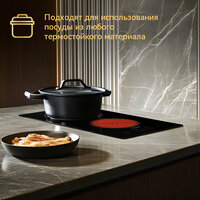 Совместим со всеми видами кухонной посуды, независимо от материала, из которого она изготовлена, что упрощает использование с имеющейся у вас посудой и экономит затраты на приобретение новой. Однако обязательно используйте посуду соответствующего размера и диаметра, чтобы полностью оптимизировать эффективность нагрева варочной панели.