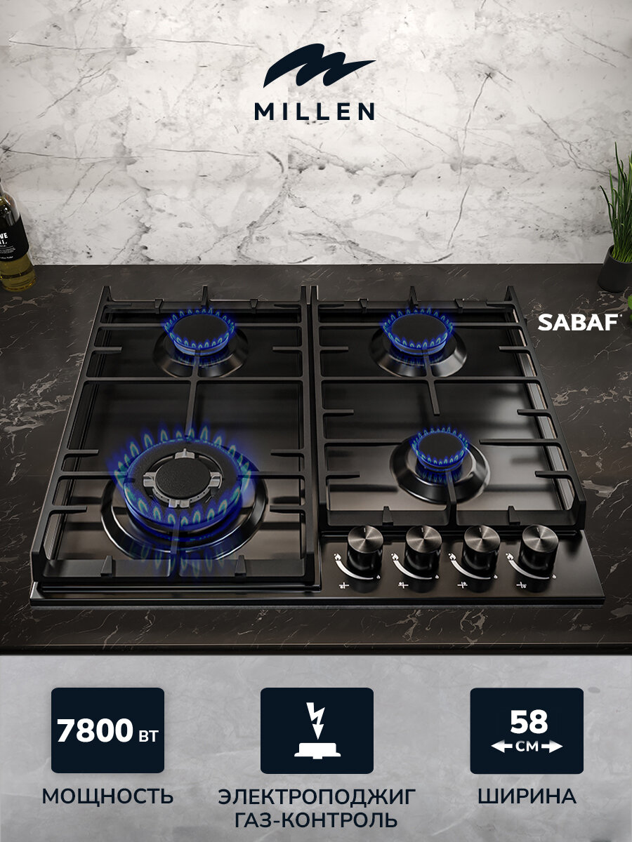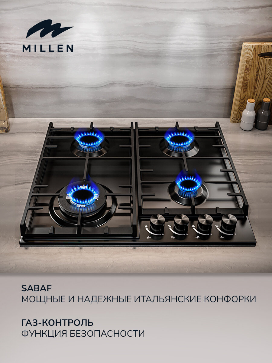 Варочная панель встраиваемая, газовая MILLEN MGH 602 BL, черный, ширина 60 см, 4 конфорки, материал поверхности: эмаль, материал решёток: чугун, электроподжиг, газ-контроль: сравнение цен, характеристики, фото, актуальное наличие и цены.
