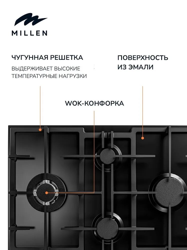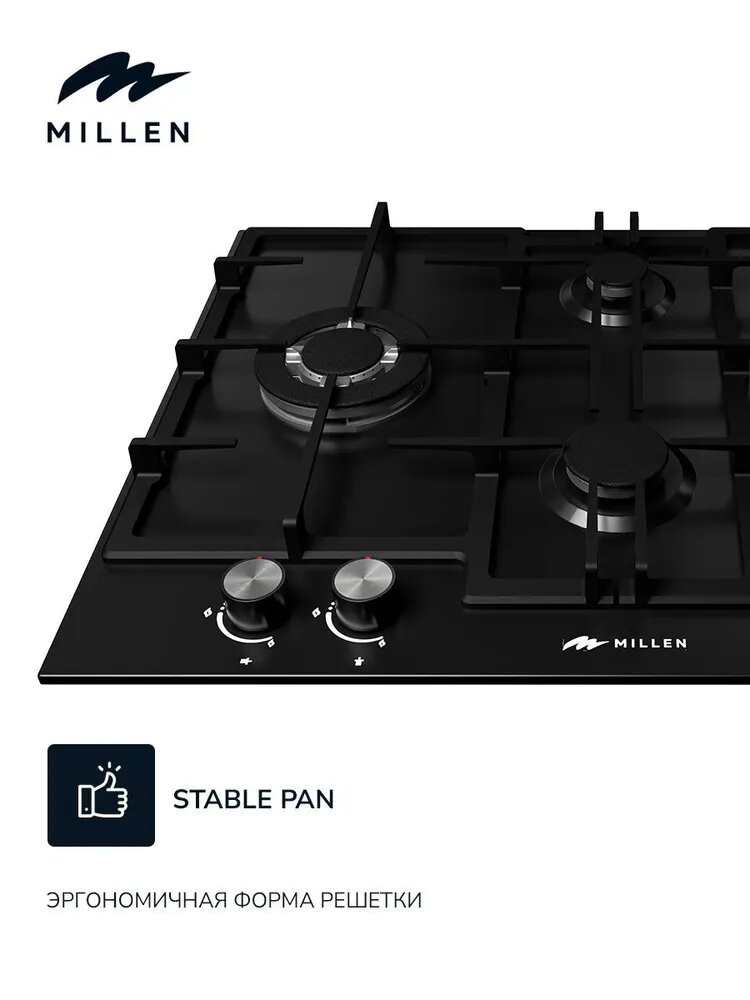 Варочная панель встраиваемая, газовая MILLEN MGHD 6501 BL, черный, ширина 65 см, 4 конфорки, материал поверхности: эмаль, материал решёток: чугун, электроподжиг, газ-контроль: сравнение цен, характеристики, фото, актуальное наличие и цены.