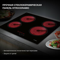 | Безопасность | защитное отключение конфорок, индикатор остаточного тепла, кнопка блокировки панели |