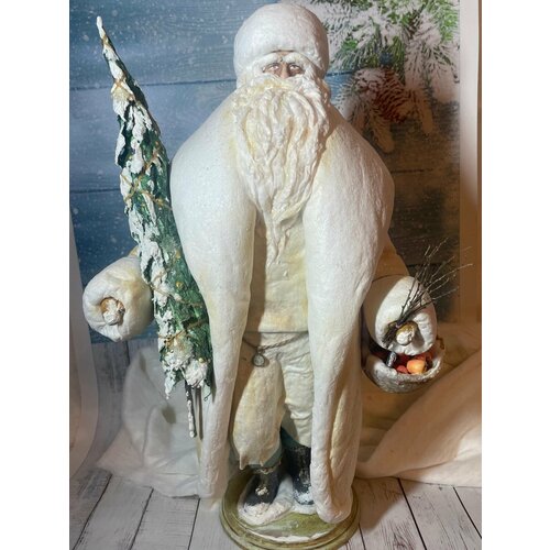 Дед мороз, ватная игрушка в ретро стиле, на подставке. В комплекте с двумя куклами и две зверюшки. Расписан акриловыми красками и пастелью, украшен слюдой.