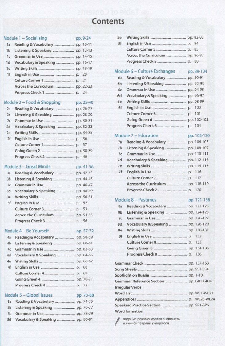 Учебно-методический комплект "Английский в фокусе. 8 класс" предназначен для учащихся 8 класса, продолжающих изучение английского языка в основной общеобразовательной школе. Материал создан интернациональным авторским коллективом: российским издательством "Просвещение" и британским издательством-партнёром Express Publishing (Ю. Е. Ваулина, Д. Дули, О. Е. Подоляко, В. Эванс). Учебник рассчитан на 3 часа в неделю в общеобразовательных организациях. Имеет четкую модульную структуру: 8 тематических модулей, раздел аутентичной информации о России, грамматический справочник на русском языке, а также многочисленные приложения, такие как неправильные глаголы, географические названия и многое другое. Учебник характеризуется тем, что ученики знакомятся с рациональными приемами изучения иностранного языка (Study Skills) и используют английский язык как средство изучения других дисциплин. УМК состоит из обширного количества разнообразных компонентов, в т. ч. мультимедийных: учебник, рабочая тетрадь, рабочая программа 5-9 (на сайте), аудиокурс (на сайте), книга для учителя, языковой портфель, книга для чтения ("Кентервильское Привидение"), аудиокурс к книге для чтения (на сайте), тренировочные упражнения в формате ОГЭ.
