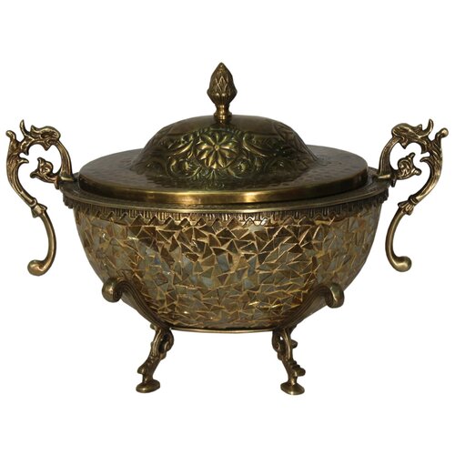 Ваза для фруктов выполнена из стекла и декорирована стеклянной мозаикой золотистого цвета. Крышка из латуни, а удобные съёмные ножки и изящные ручки выполнены из бронзы.