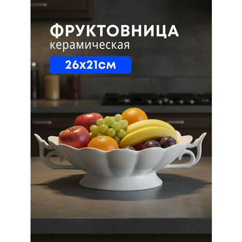 Красивая белая фруктовница может служить сервировочной подставкой для конфет или десертов. Удобный сервировочный элемент украсит стол во время праздника и в повседневной жизни. Керамическая подставка особенно будет уместна на новогоднем столе. Это идеальный подарок бабушке или маме на Новый год, 8 марта или День Рождения. Вазу для фруктов можно использовать как центральный элемент декора стола во время семейных встреч.