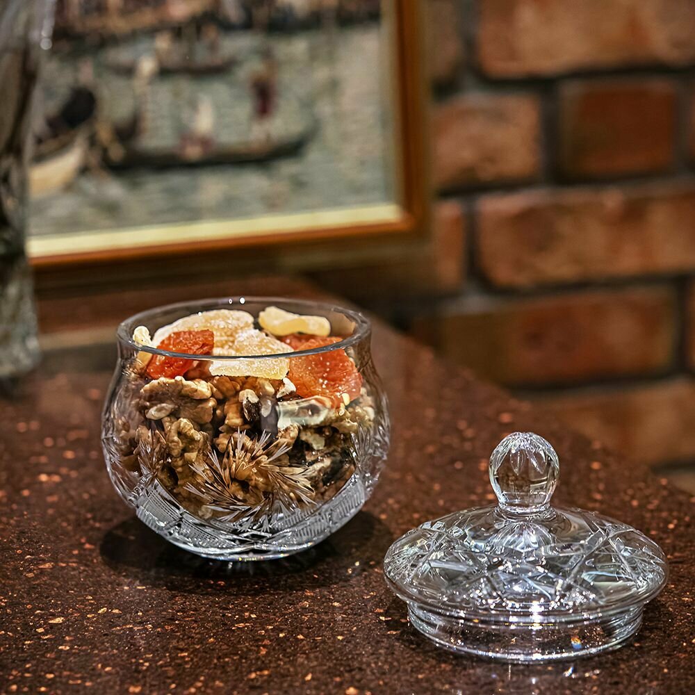 Хрустальная ваза с крышкой для сервировки может использоваться для конфет, сладкого и печенья, а так же как элемент интерьера в гостиной или спальне. В такой хрустальной вазе с крышкой удобно хранить даже красивые украшения. Изделие имеет привлекательный внешний вид благодаря роскошному резному узору "Мельница" (1000/1).