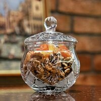 Хрусталь не тускнеет и не желтеет со временем, не царапается. Высота с крышкой –14,6 см, диаметр – 12,5 см. Примерный объем 600 мл.