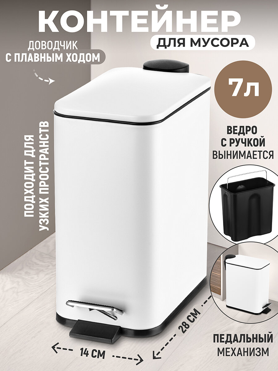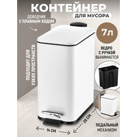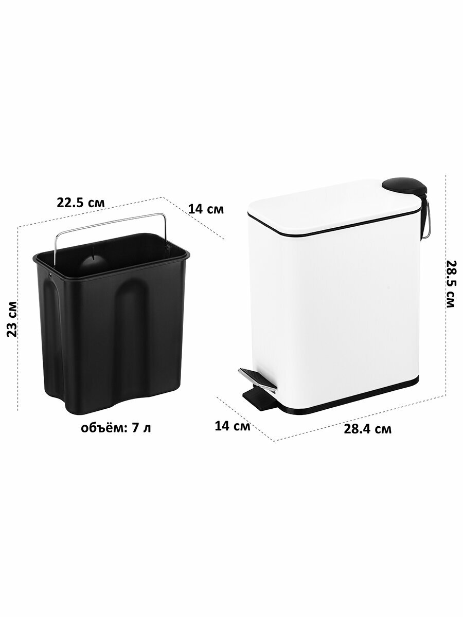 Прямоугольный контейнер для мусора от бренда ELCASA предназначен для организации порядка в вашем доме, например, в комнате или на кухне. Имеет матовую поверхность. Урна оснащена крышкой – она не пропустит запахов и не допустит выпадения мусора. Крышка с микролифтом плавно закрывается без резкого звука. Размер изделия – 28,4х14х28,5 см, объём – 7 литров. Внешняя ёмкость белого цвета выполнена из металла, имеет внутри чёрное пластиковое ведро размером 22,5х14х23 см. Размер дна ведёрка 20х11,5 см. Крышечка открывается педальным механизмом. Педаль легко нажать – вам не потребуется прикладывать усилий. Внутреннее и внешнее ведро мусорной корзины оснащены металлическими ручками, благодаря чему каждый элемент будет удобен для переноски. Компактная мусорка отлично послужит вам для уборки и наведения порядка – её легко взять с собой в нужную комнату. Подойдёт для уборки стола и полок, перебирания канцелярии и бумаг. Напольная мусорная корзинка найдёт своё место в любой части вашего дома. Поставьте её под рабочим столом или на кухне под раковиной, чтобы выбрасывать в неё кожуру, остатки еды или бумажные полотенца. Разместите мусорный бачок в туалете возле унитаза для утилизации гигиенических и косметических принадлежностей. Компактный мусорный бак станет прекрасным помощником для любителей рукоделия – можно держать под рукой и с удобством избавляться от излишков материала. Подойдёт для размещения возле мойки или офисного стола. Ведерко с универсальным дизайном будет стильным дополнением любого интерьера. Не рекомендуется применять абразивные моющие средства. Компактная мусорная урна станет практичным дополнением вашего дома, офиса и дачи.