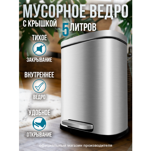 ведро оснащено удобной педалью и микролифтом, обеспечивающим плавное открывание и закрывание, нескользящее пластиковое основание предупреждает повреждение пола и надежно удерживает ведро, современный стиль и инновационные решения, вместимость 5 литров, удобство использования и современный дизайн