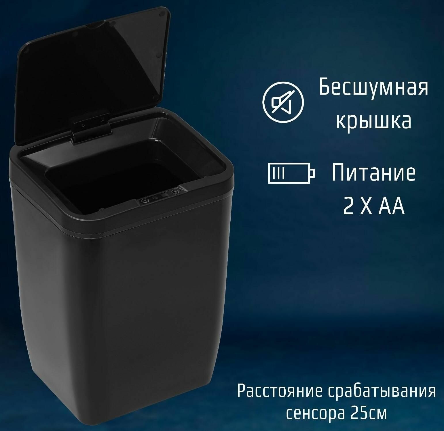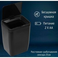 - Сенсорный датчик обеспечивает автоматическое открытие крышки при приближении пользователя на расстояние до 15 см. Крышка плотно закрывается через 5 секунд после удаления отходов, предотвращая распространение неприятных запахов и загрязнение воздуха.