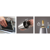 Ведерко для охлаждения вина в серебристом корпусе из нержавеющей стали позволяет за 5 минут охладить бутылку вина емкостью 0,75 л от комнатной температуры до необходимой и поддерживать ее несколько часов. Вам просто требуется вынуть из корпуса мягкую охладительную рубашку (открыв крышку снизу корпуса), поместить ее в морозильную камеру, а когда вам потребуется, достать ее из морозильной камеры, вставить в металлический корпус и поместить бутылку в это ведерко. Ваш напиток остается холодным в течение нескольких часов. Это свойство достигается благодаря нетоксичному гелю, содержащемуся внутри мягкой рубашки.