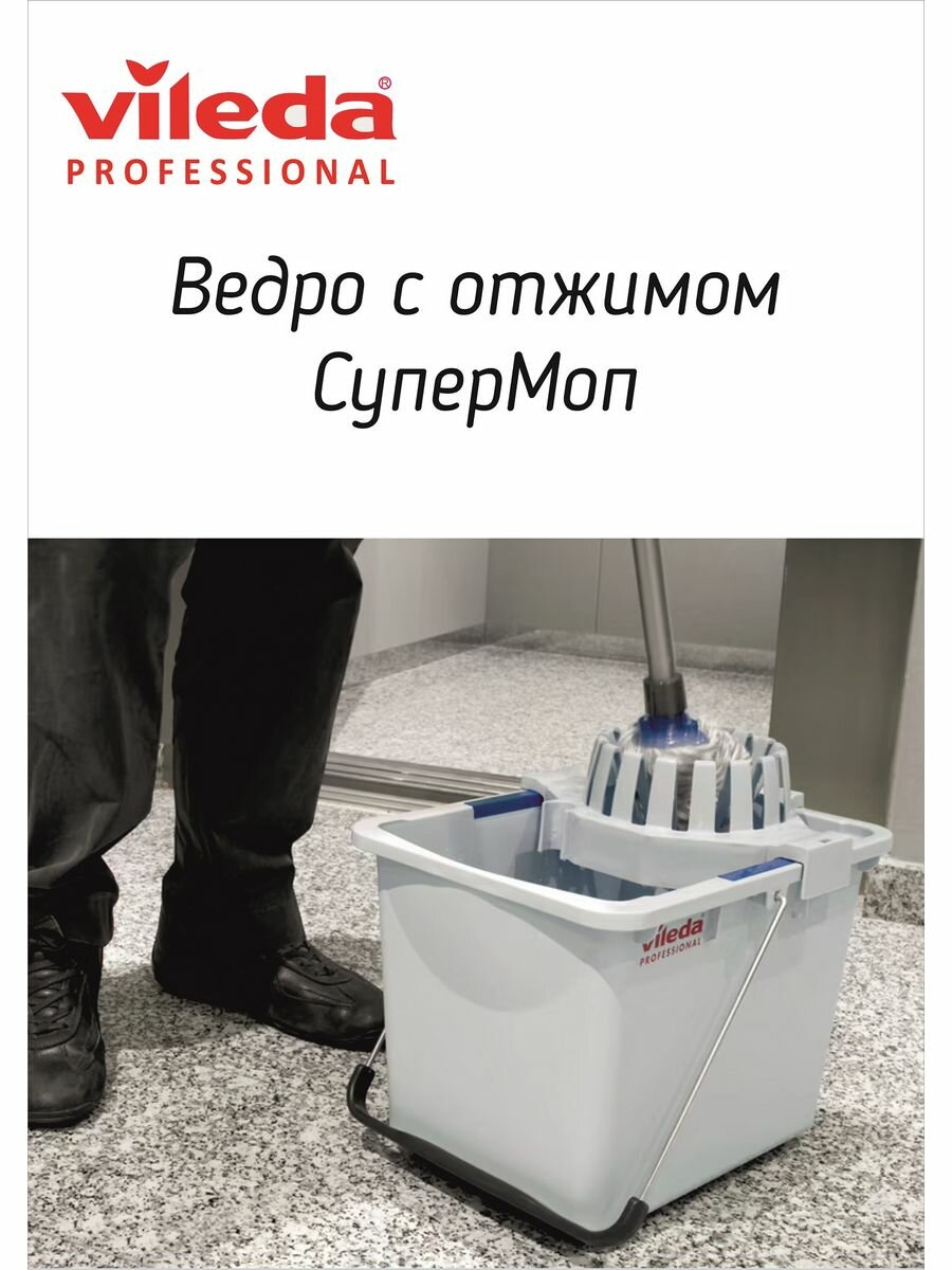 Ведро с отжимом для системы СуперМоп для уборки методом «ведро-вода». СуперМоп –компактная система с мопом веревочноготипа для уборки на небольших площадях до 75 м2. Легкая, компактная и прочная конструкция. Отжим надежно крепится на ведре и легко снимается при необходимости. Отжим имеет 3 точки опоры, что обеспечивает стабильность и упругость конструкции в процессе отжима. В процессе отжима розетка отжима складывается, усиливая давление на моп и улучшая тем самым результат отжима. Ведро имеет специальный носик для быстрого слива без разбрызгивания и уступ на дне для пальцев для удобного хвата. Эргономичная ручка для удобной переноски. Мерная шкала на внутренней стенке ведра. Ведро, вставка, отжим -100% полипропилен. Ручка –оцинкованная сталь.