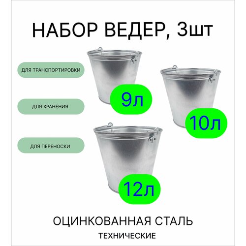 Ведра оцинкованные объемом 9 литров, 10 литров, 12 литров. Общий объем ведер 31 литр. Набор производится компанией УралИнвест по ГОСТ 20558-82. Ведро изготавливается из тонколистового оцинкованного проката и предназначено для нужд народного хозяйства, хранения и переноски холодной воды и ГСМ. Ведро оцинкованное не предназначено для хранения и транспортирования пищевых продуктов.