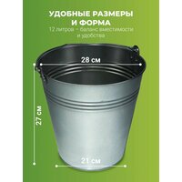 Наличие крышки у оцинкованного круглого ведра на 12 л от отечественного производителя не предусмотрено. Зато его поверхность устойчива к образованию очагов ржавчины. А универсальный серебристый цвет сочетается с остальным инвентарем, используемым во время уборки листьев или выполнения хозяйственных работ. Сфера использования изделия широка: от сбора мусора на прилегающей территории и внутри зданий до переноски и хранения овощей.